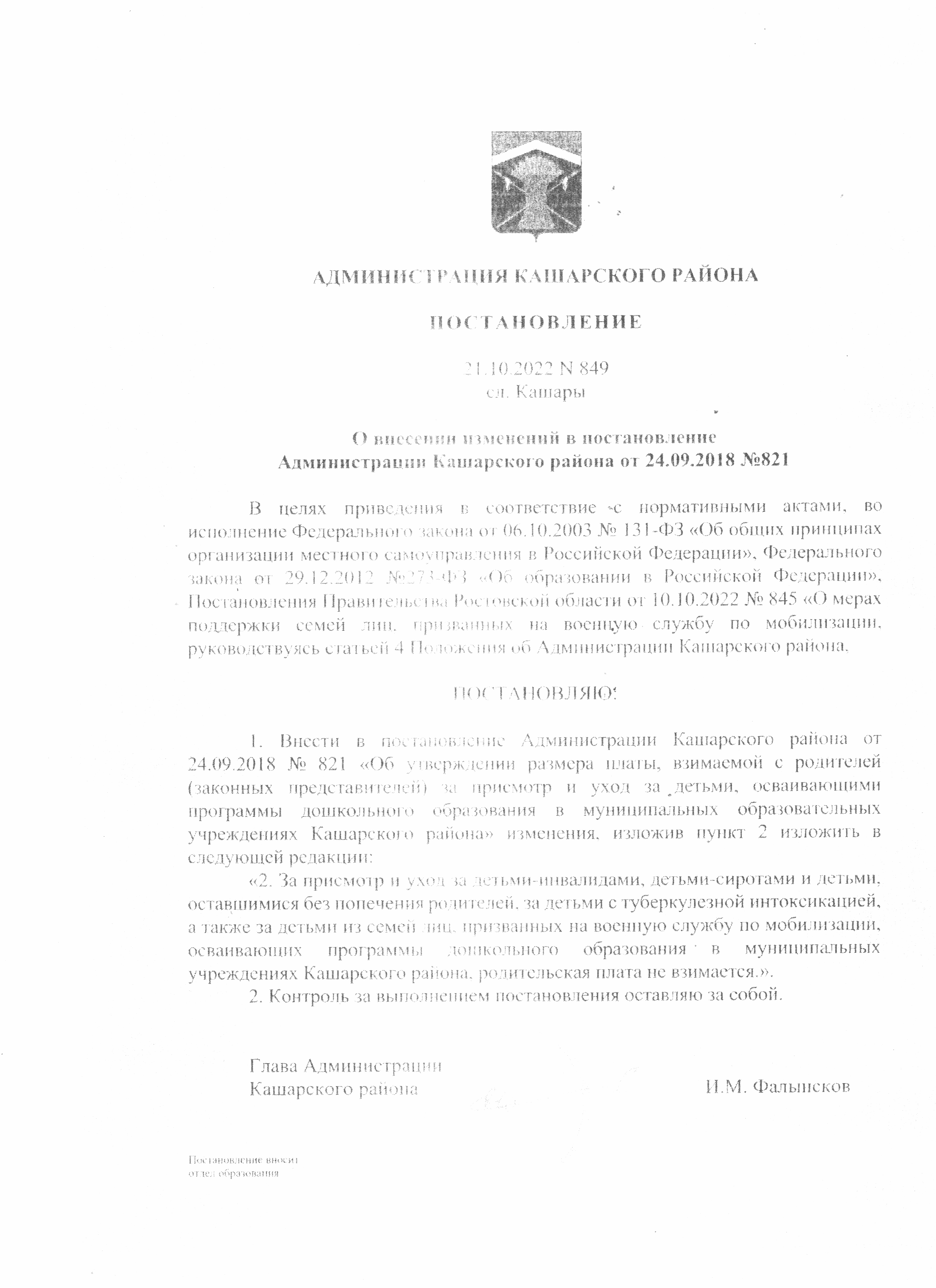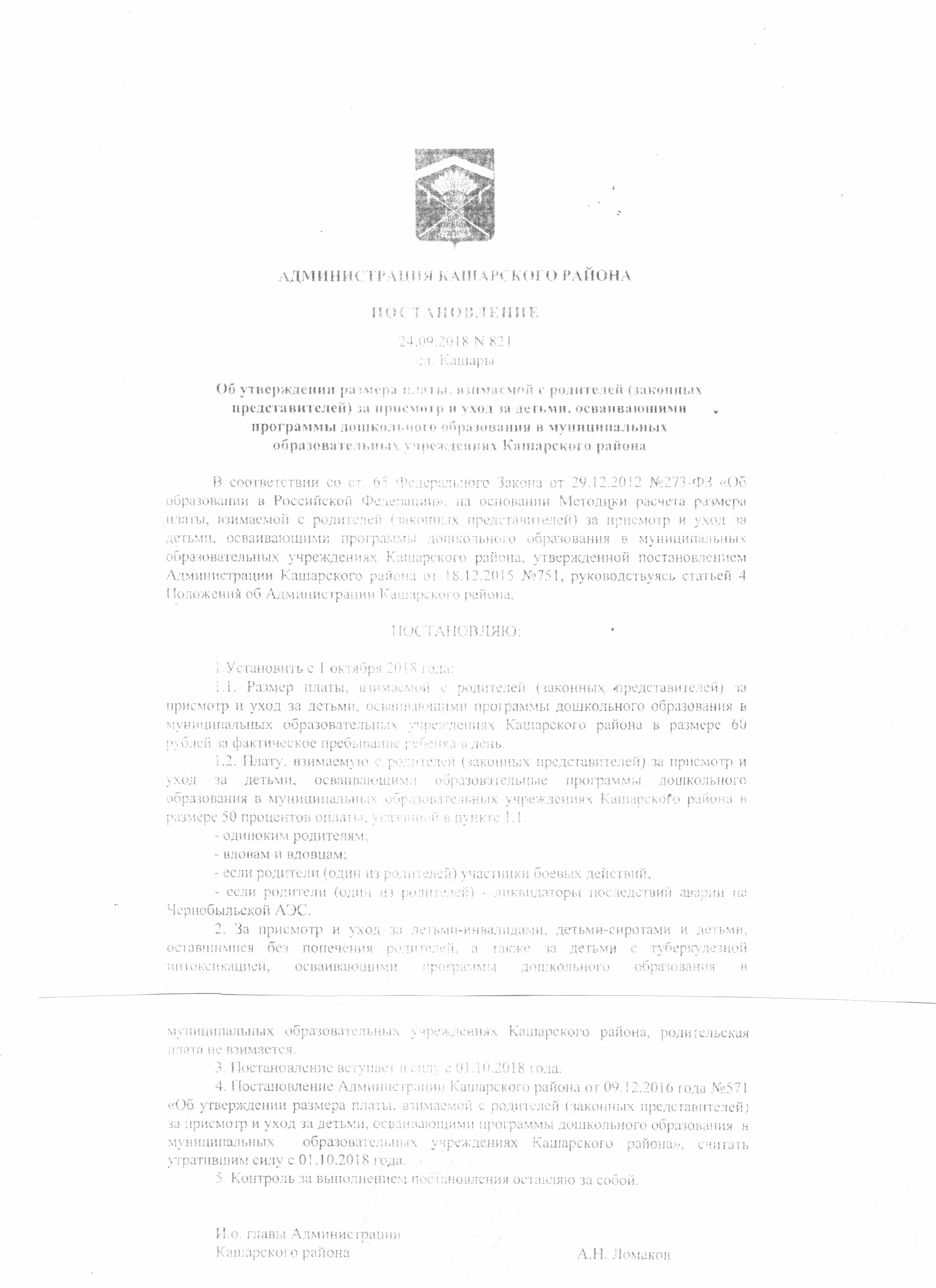 Документ об установлении размера платы, взимаемой с родителей (законных представителей)